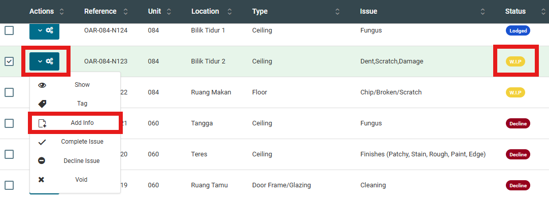 2. Select issue with WIP/Redo status, click on the configuration button and select "Add Info".