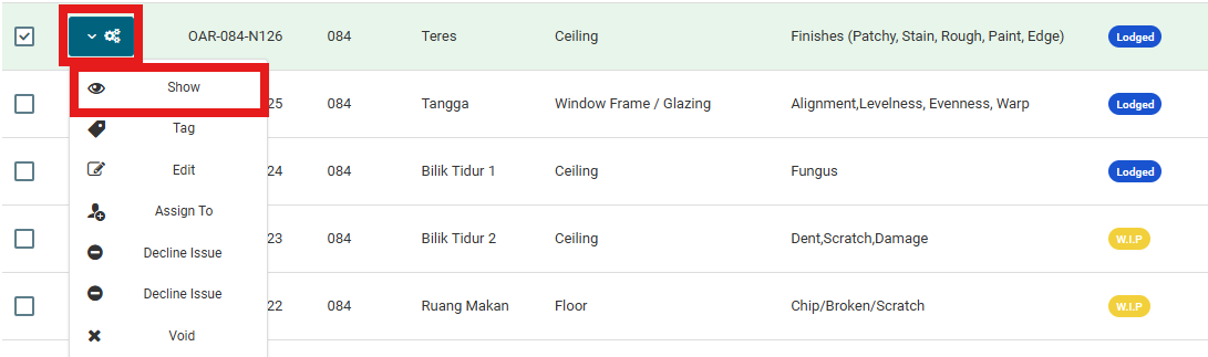 * Issue Status: Lodge/Pending Access/WIP/Redo/Completed/Void