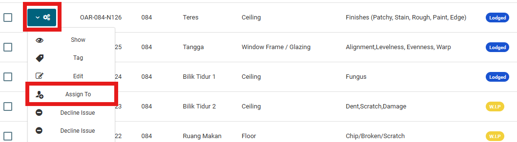 User can assign Lodged issue to another project team/inspector, when user decide the issue need further inspection before confirming it as an issue.