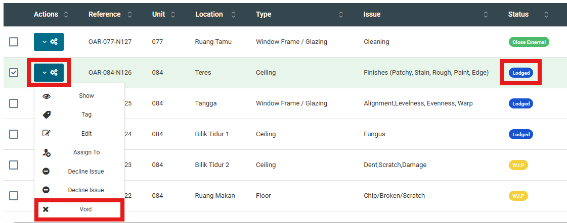 User can change issue status to VOID for a single lodged issue, if user want to remove the issue when you intentionally or accidentally submit an issue.