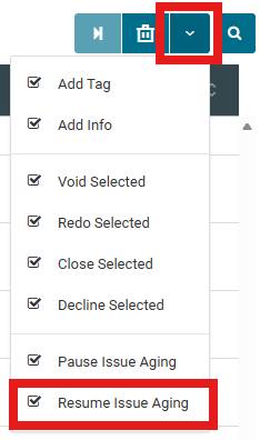 3. Select dropdown from the rightmost section and click "Resume Issue Aging".