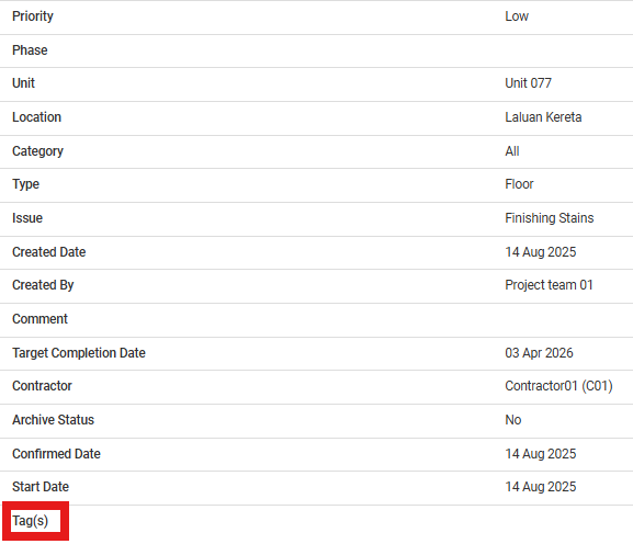 6. Check on "Tag(s)" to ensure there is no tag. And check on "History" down the page to verify the timeline to ensure that the issue aging has been resumed.