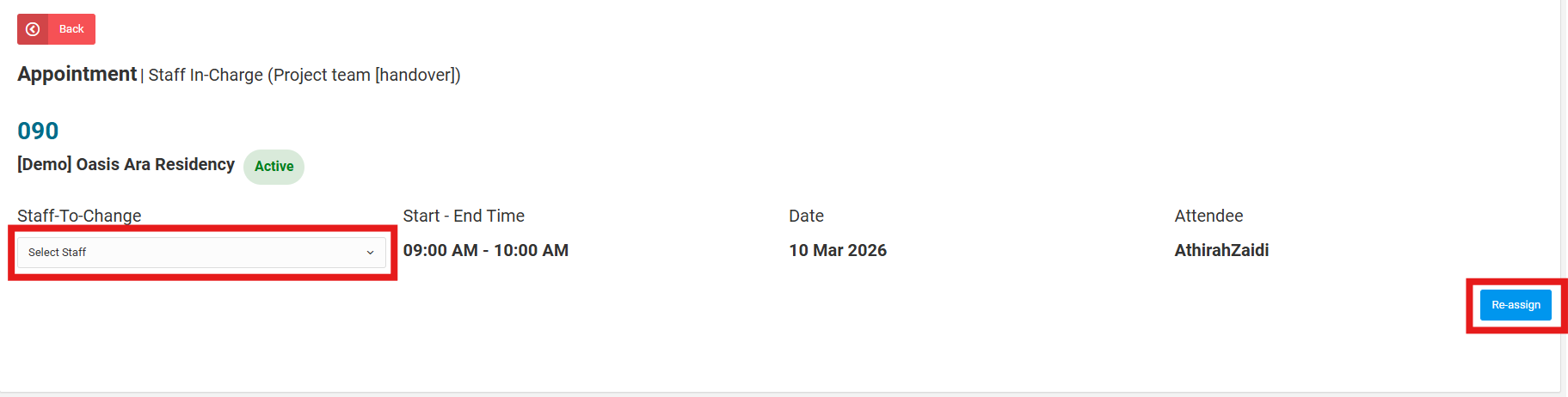 Admin or user can reassign staff for an appointment. If the staff is not available on that date, admin can reassign a new staff for the appointment.