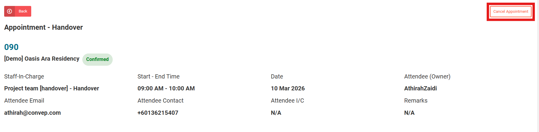3. User can view appointment details. To cancel appointment, click on the top rightmost button "Cancel Appointment".