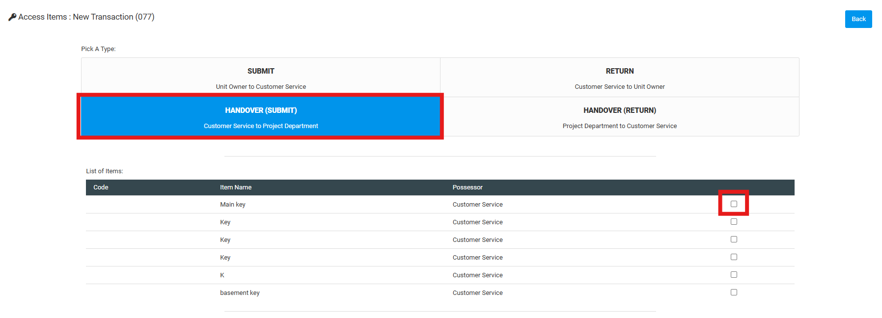 2. Click "Handover (Submit)". Click the items on the list of items checkbox and click the "Submit" button.