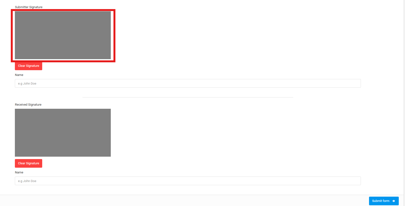 5. Scroll down and sign off inside "Submitter Signature" and "Received Signature". Click "Clear Signature" to reset the signature. Click "Submit Form" button.