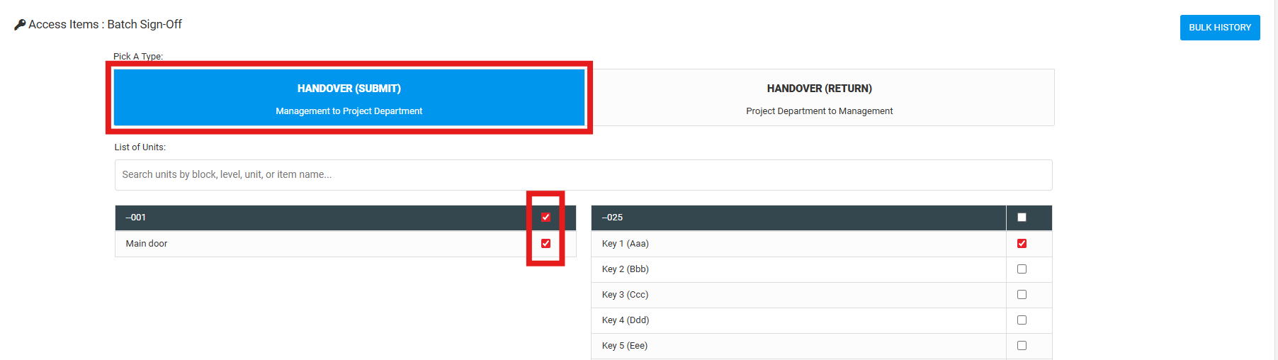 4. Select "Handover (Submit)". Click the items on the list of items checkbox.