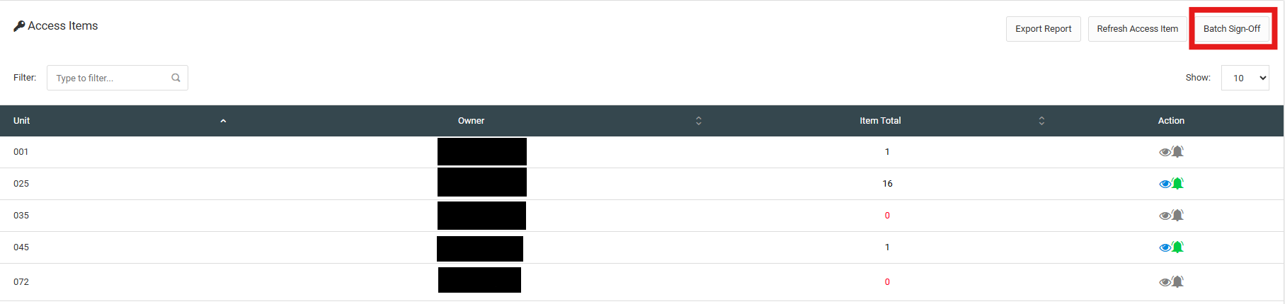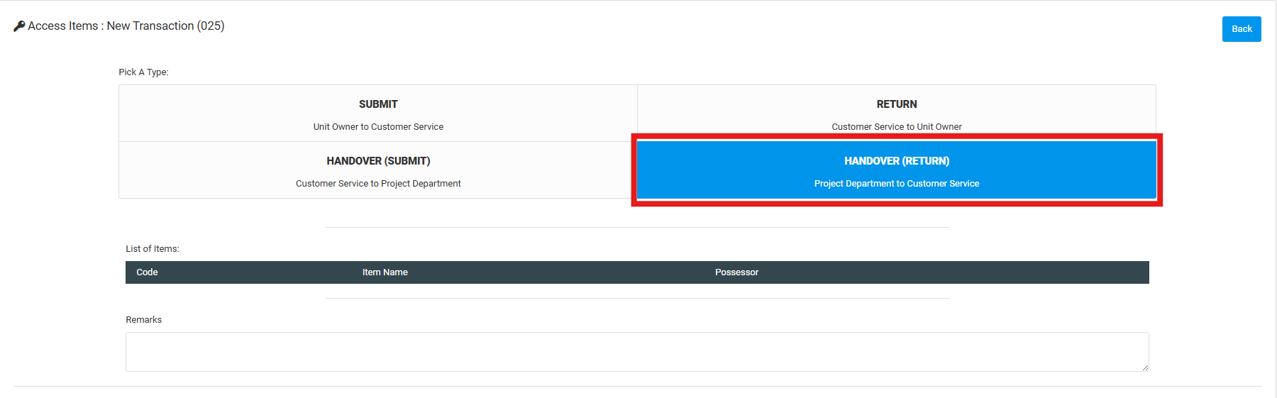 User can view and submit handover access items to return. This process involves project department to submit the handover return to customer service. This can be done by single sign-off or batch sign-off.