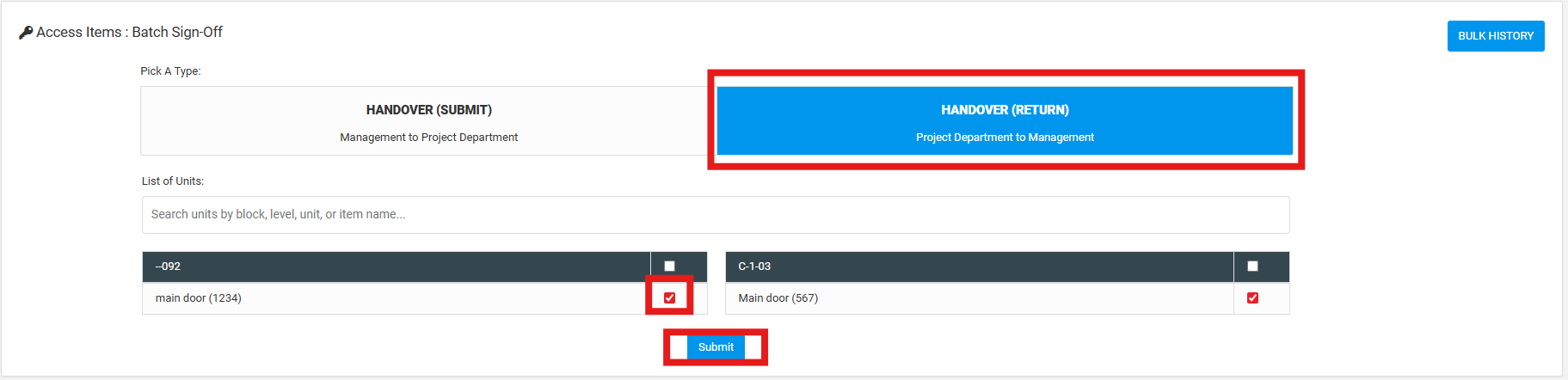 2. Click "Handover (Return)". Click the items on the list of items checkbox and click the "Submit" button.