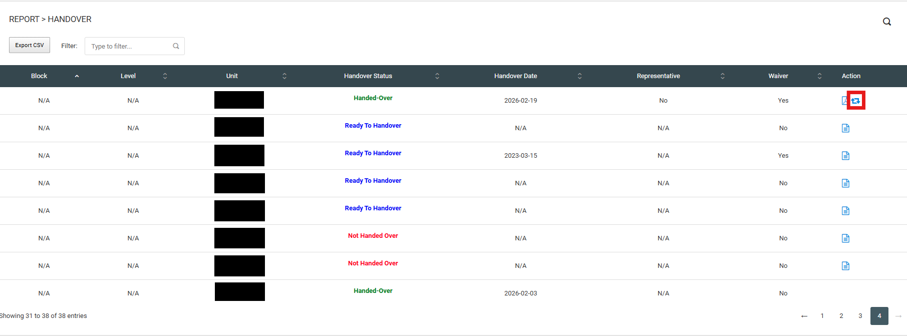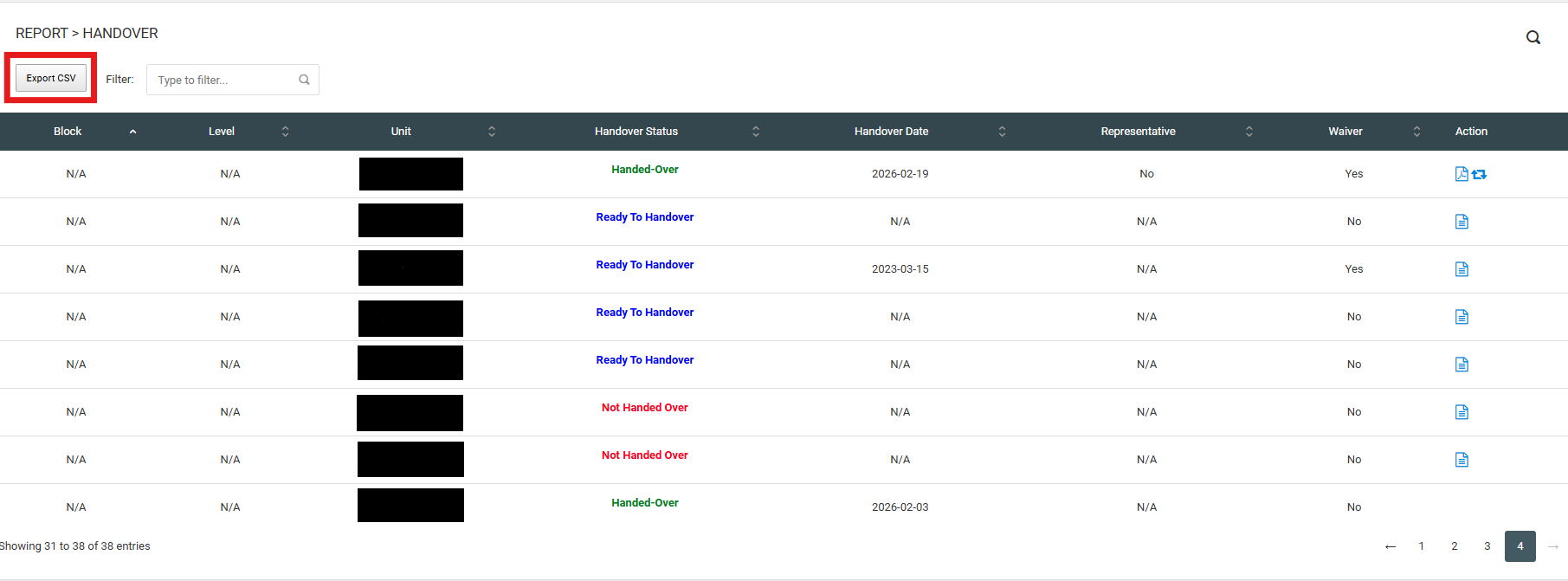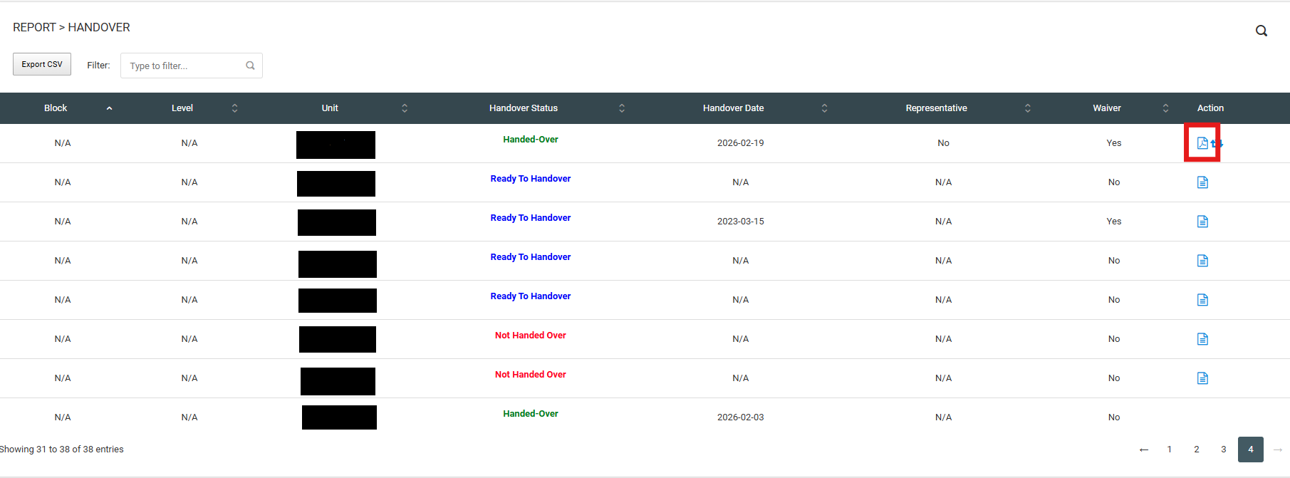 User can access handover documents in the web. User can view PDF, regenerate PDF and export CSV.