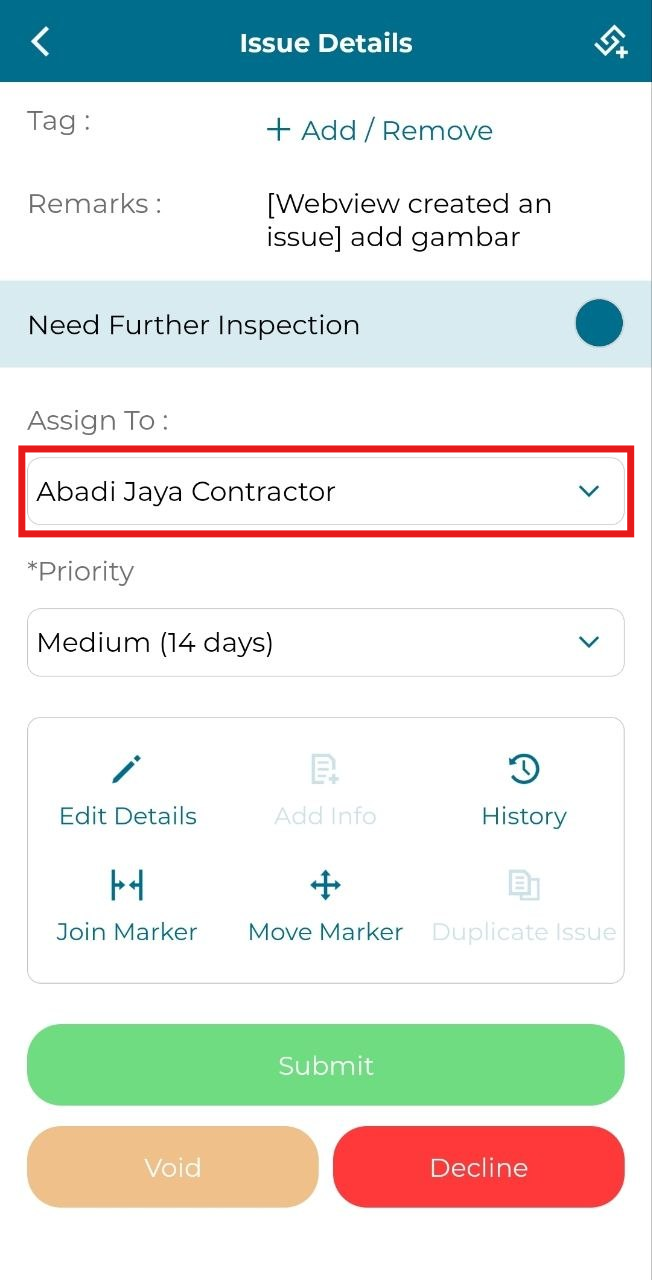 User can assign 'Lodged' issue to another contractor and project team.