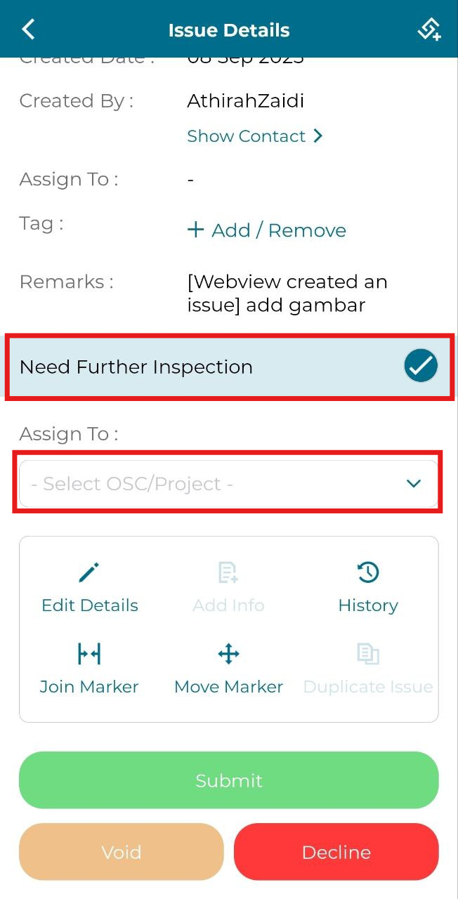 3. Tick 'Need Further Inspection', if need project team to make another inspection. Then assign to OSC/Project team and click 'Submit'.