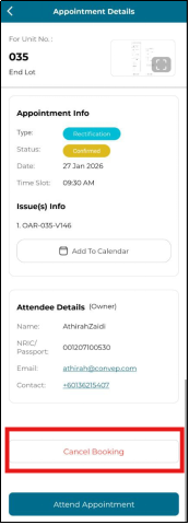 Rectification appointment is the type of appointment for the situation when Unit Owner/Owner decide/want issue(s) to be fixed by rectification (By Appointment). The contractor will see their appointment here.